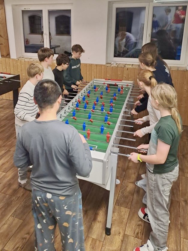 Wie schon seit vielen vielen Jahren fand im Januar 2026 die Schneesportfahrt des 7. Jahrgangs statt. Mit einem aufregenden Kribbeln im Bauch und von Vorfreude gezeichneten Gesichtern sammelten sich die Schülerinnen und Schüler der Jahrgangsstufe 7, zahlreiche Ski- und Klassenlehrer sowie acht Schülerbetreuer der Oberstufe am 16.01. am Böllenfalltor. Nach einer angenehmen, entspannten und lustigen Fahrt kamen alle gegen 16 Uhr im „Schlössle“ an. Die Betreuer und Lehrer transportierten das Gepäck, sodass bei der Ankunft alles im Hof des Jugendhauses aufgestellt war. Nachdem jedes Gepäckstück früher oder später bei seinem Besitzer ankam, wurde das Gebäude erkundet, die Zimmer begutachtet und alles eingerichtet. Kurz darauf folgte das sehnsüchtig erwartete Abendessen in den Speisesälen. Das Essen war nicht nur super, der Tischdienst sorgte auch jeden Tag dafür, dass für den Rest alles bereitstand. Bevor der Tag schließlich im Bett zu Ende ging, wurde der Abend gemeinsam mit Gesellschaftsspielen, Tischkickern und der ein oder anderen Runde Tischtennis verbracht. Ein weiterer Teil des Abendprogramms war die Zimmerkontrolle. Während manche mit einem Hauch von Panik versuchten, das dreckige T-Shirt unter dem Bett zu verstecken, wurden die Betreuer, die die Kontrolle durchführten, ein ums andere Mal mit kreativen Ideen unterhalten. Zimmer wurden kontrolliert, Schüler ins Bett gebracht und Punkte notiert. Das sauberste und kreativste Zimmer sollte am Ende der Fahrt eine Überraschung bekommen. Nachdem all dies geschehen war, konnten auch die Lehrer und Betreuer in geselliger Runde den ersten Tag ausklingen lassen. Weitere Abende mit bester Unterhaltung, lustigen Spielen, alten Geschichten und tiefgründigen Gesprächen sollten folgen…:)