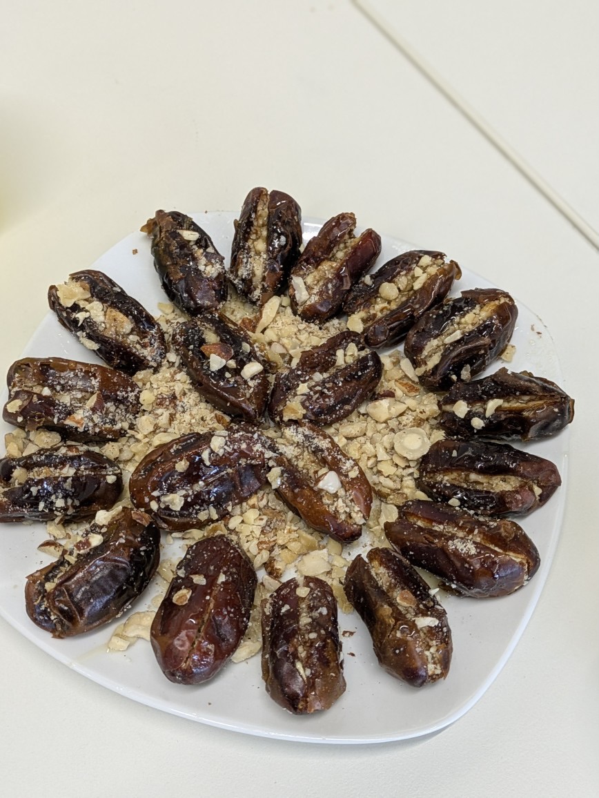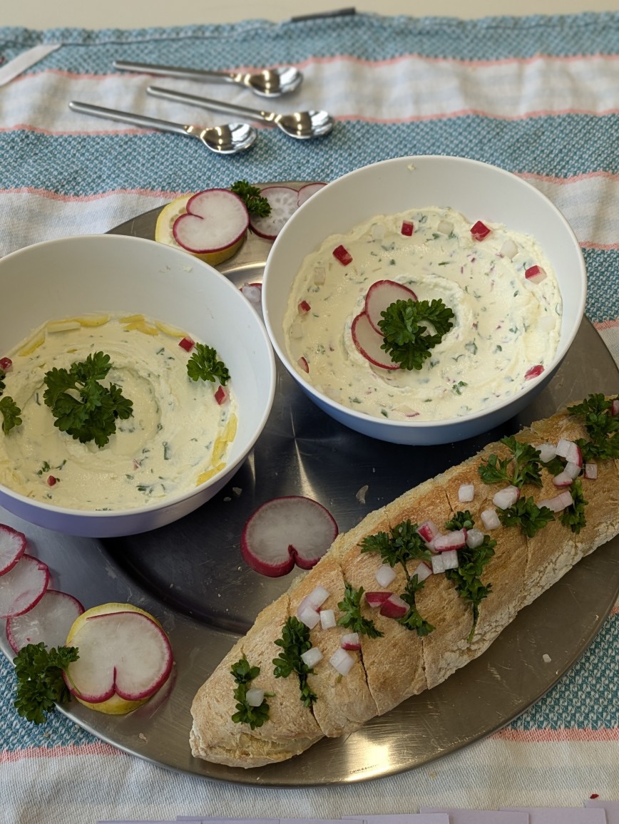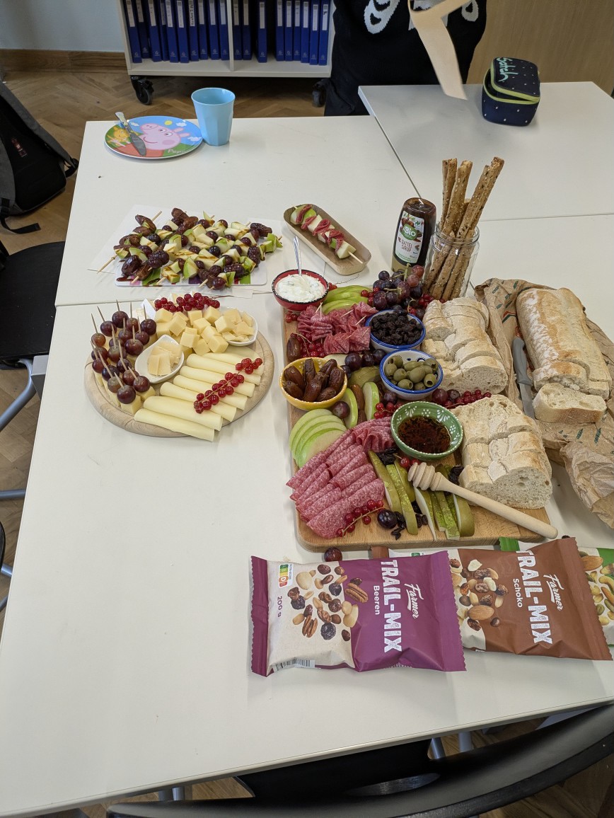Auf den folgenden Bildern seht ihr Posca (ein erfrischendes Getränke, bestehend aus Wasser, Traubensaft und Essig), Moretum (ein würziger Aufstrich aus Käse, Kräutern und Knoblauch), dulcia domestica (gefüllte Datteln) und natürlich Brot, Käse, Früchte und Nüsse.