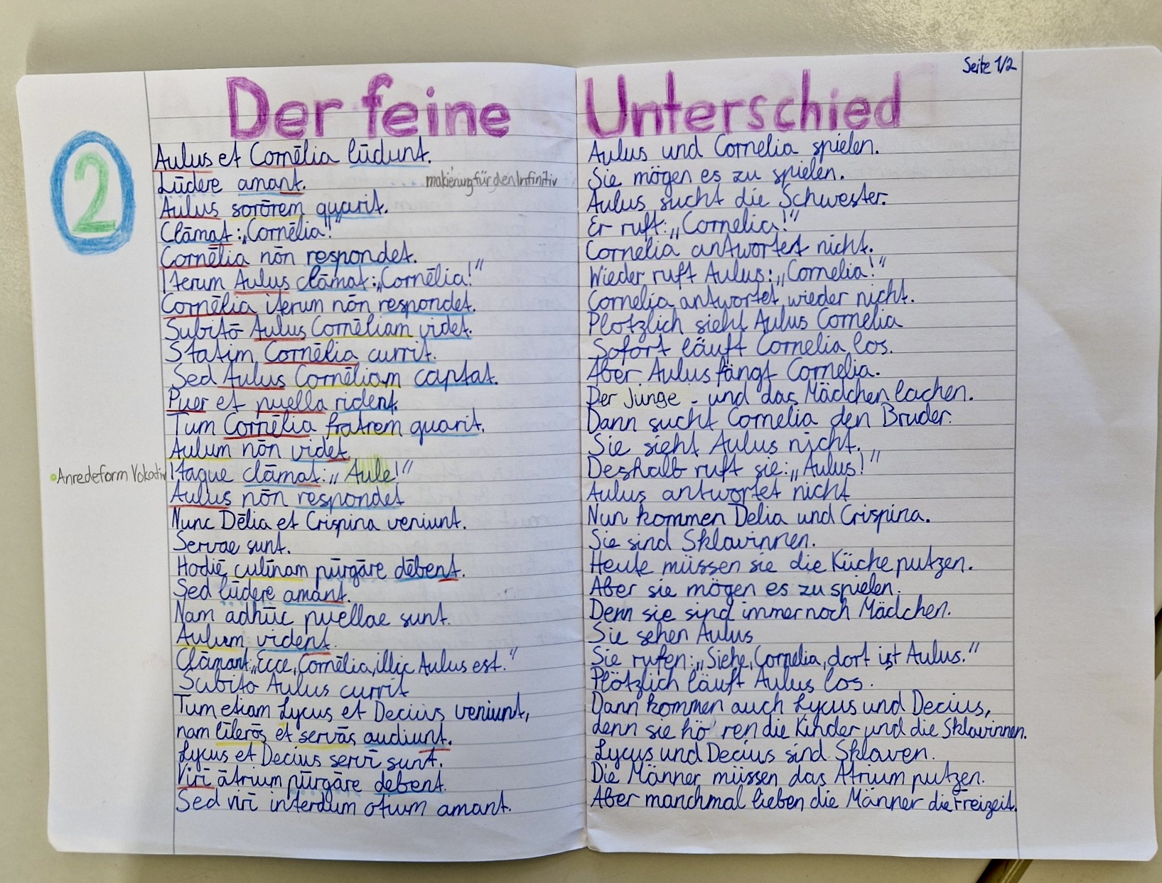 Hier könnt ihr sehen, wie eine typische Übersetzung eines lateinischen Textes in eurem Heft aussehen kann. Neben der Übersetzung ins Deutsche wird es auch sehr bunt, wenn wir vorher überlegen, was Subjekte und Prädikate im lateinischen Satz sind!